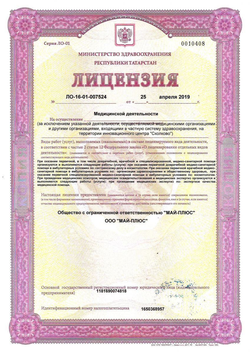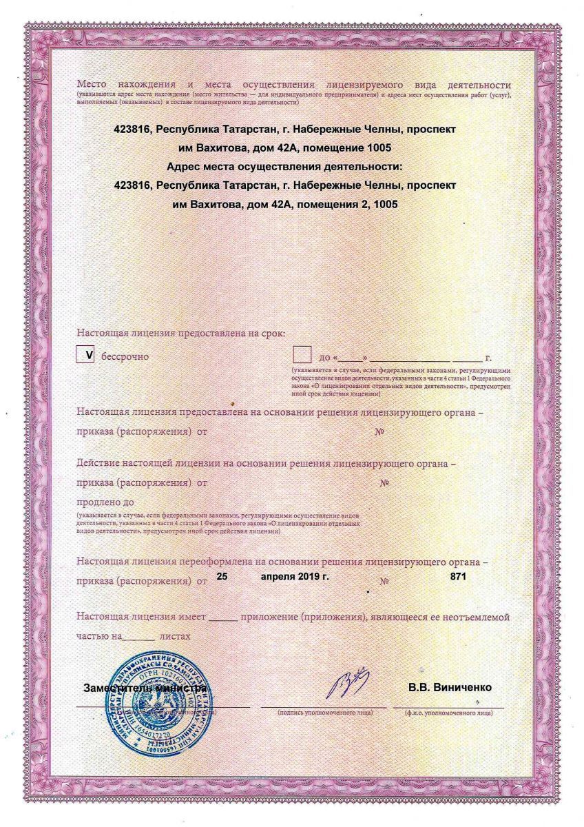 Лицензия на осуществление медицинской деятельности ЛО 16-01-007524 от 25 апреля 2019 г., выдана Министерством здравоохранения Республики Татарстан. Адрес органа выдавшего лицензию: Министерство здравоохранения: 420111, г. Казань, ул. Островского, д. 11/6